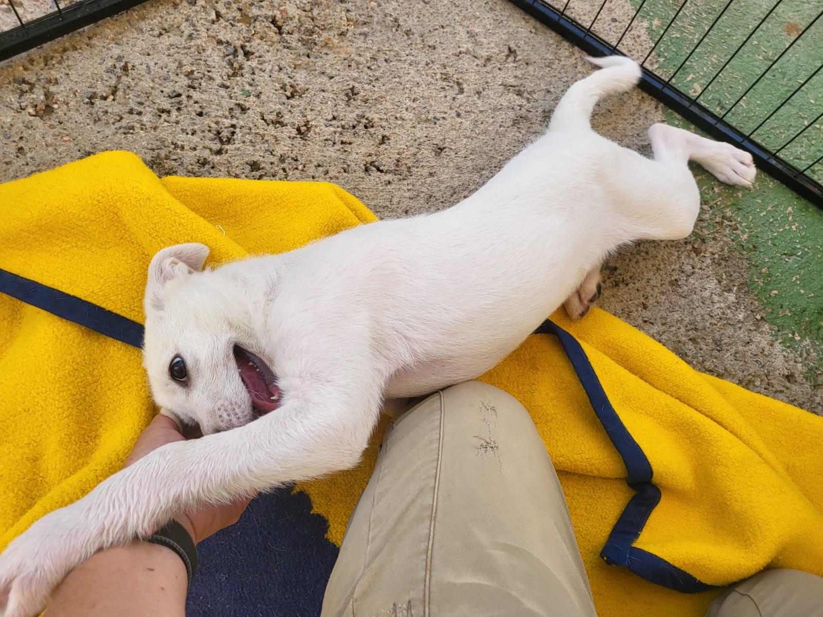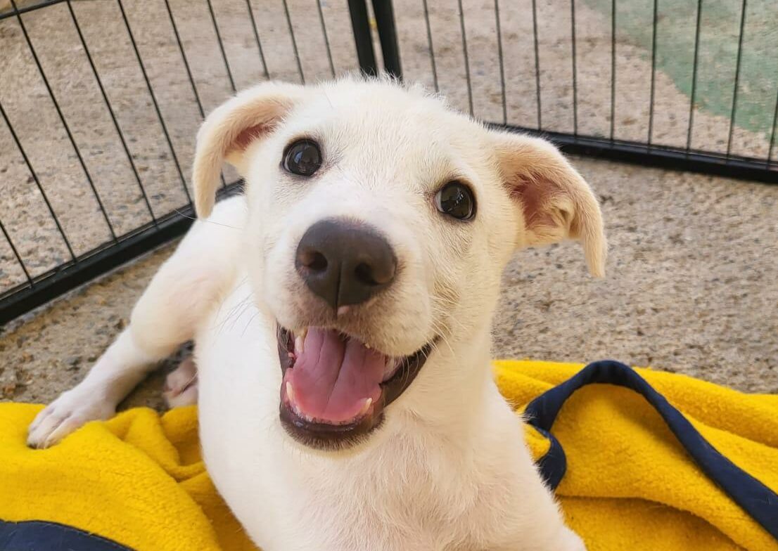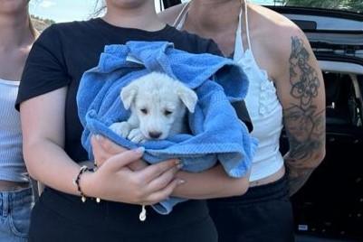 Wir lagen gerade am Strand, als das Telefon meiner Kollegin ging. Ein junges Paar, dass gerade einen kleinen Welpen gefunden hatte. Wir setzten uns ins Auto und machten uns auf den Weg. Auf halber Strecke haben wir uns getroffen und den kleinen Welpen übernommen.