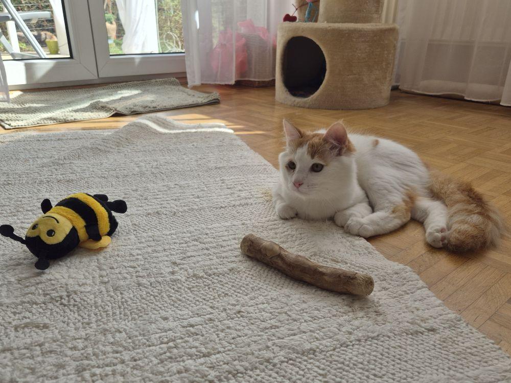 Auf seiner Pflegestelle fordert er seiner Pflegemama alle Aufmerksamkeit ab. Pino ist selten zu müde um ein aufregendes Spiel mit der Federangel abzuschlagen oder seiner Mama hinterher zu laufen, in der Hoffnung auf ein Leckerli oder Streicheleinheiten. Mit seinen acht Monaten ist Pino in der Pubertät und voller Tatendrang. Für seine Katzenkumpeline, die schon im Seniorenalter ist, ist das manchmal sehr stressig. Trotzdem kann ihm niemand so richtig böse sein.