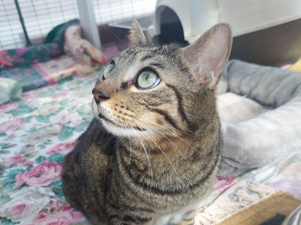Stefanino wurde als junger Kater mit Katzenschnupfen auf Sardinien gefunden und in unser Partnertierheim, L.I.D.A. Olbia gebracht. Nach seiner Quarantänezeit wurde er aus Platzmangel, und damit er nicht so einsam in einem Käfig warten musste, in das damals erste Gehege zu den Handicap Katzen gesetzt.